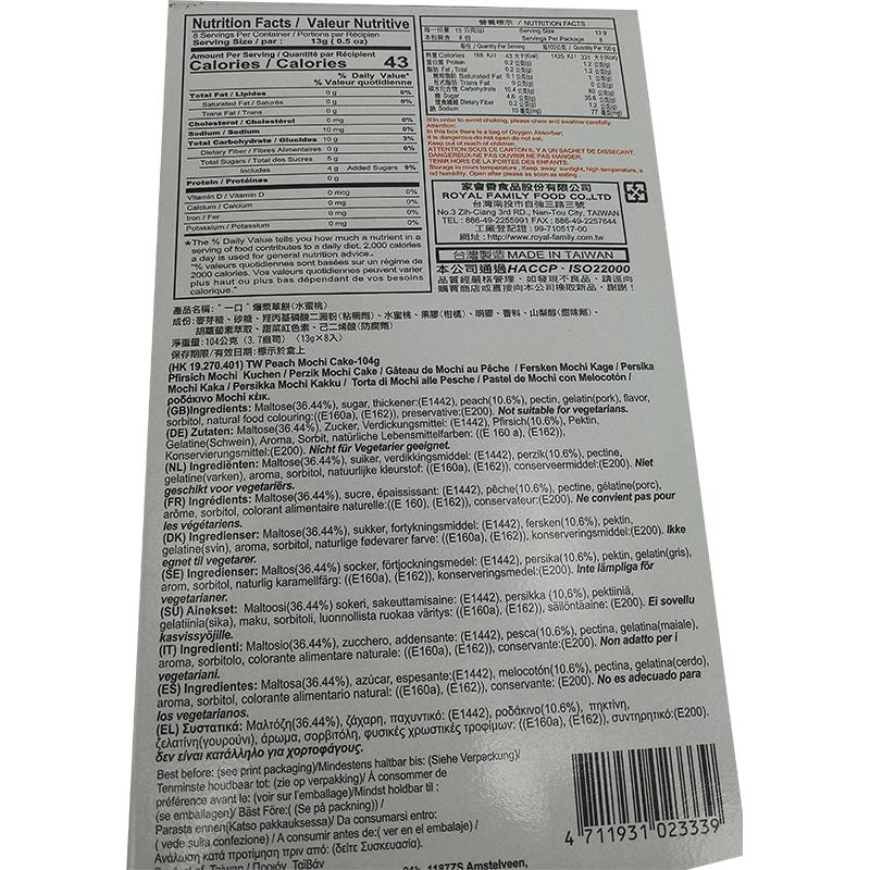 Maltose(36.44%), Zucker, Verdickungsmittel: (E1442), Pfirsich(10.6%), Pektin, Gelatine(Schwein), Aroma, Sorbit, natürliche Lebensmittelfarben: ((E 160 a), (E162)). Konservierungsmittel: (E200). Nicht für Vegetarier geeignet.