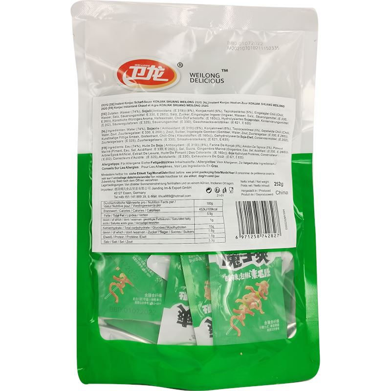 Wasser, Konjakmehl 38%, Pflanzenöl 6%, Stärke 5%, Salz 3,5%, Zucker 2,3%, Aroma 1,2%, Lebensmittelzusatzstoffe (E621 0,8%, E330 0,3%, 5′- Reinheit Dinatriumnukleotid 0,6%), Zitronensäure E330 0,3%, Titandioxid 0,2% E171, E266 0,1%, Aroma 0,08%.