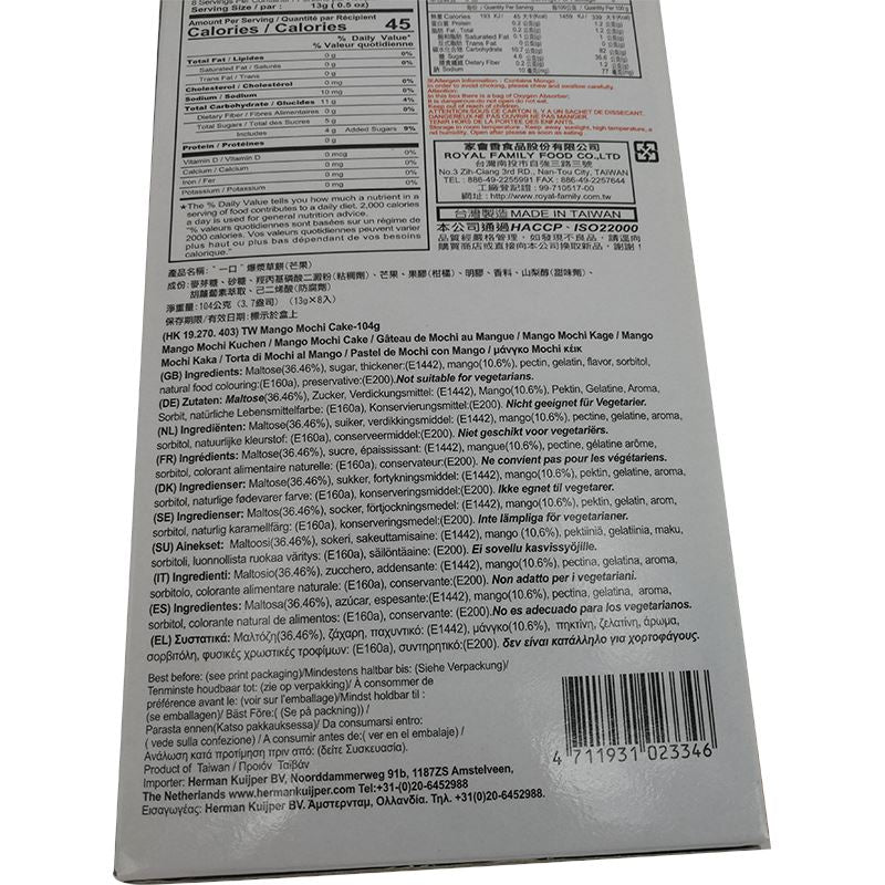 Maltose, Verdickungsmittel E1442, Zucker, Trehalose, Mango saft 9.6%, Feuchthaltemittel E420, Pektin, Gelatine (Rind), Palmöl, Farbstoff E160a, Aroma, Salz, Emulgator E471, Konservierungsmittel E202, Kartoffelstärke. Kann Spuren enthalten von Ei, Erdnuss, Sesam, Milch, Gluten, Soja, Baumnüsse, Mango.